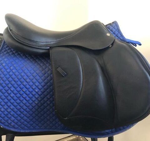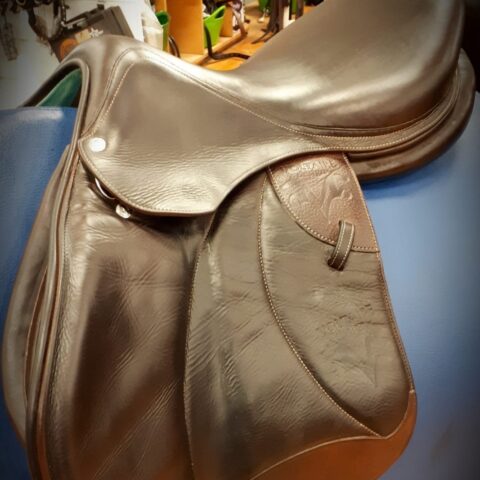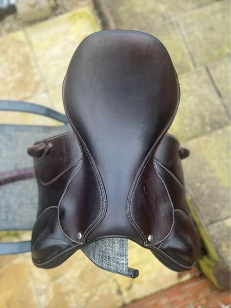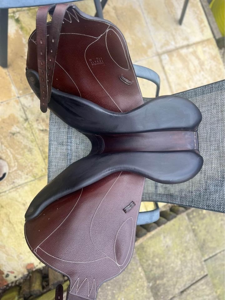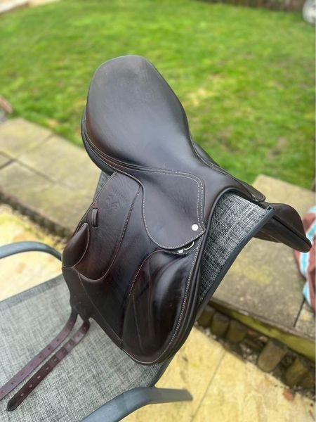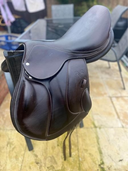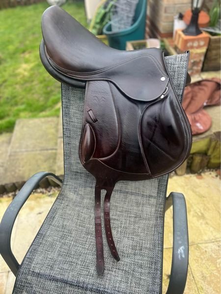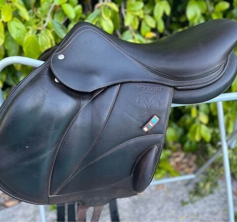 Brown Voltaire monoflap essential range saddle, 17.5inch seat and currently in medium-wide but is interchangeable gullet by Voltaire. Saddle cover included