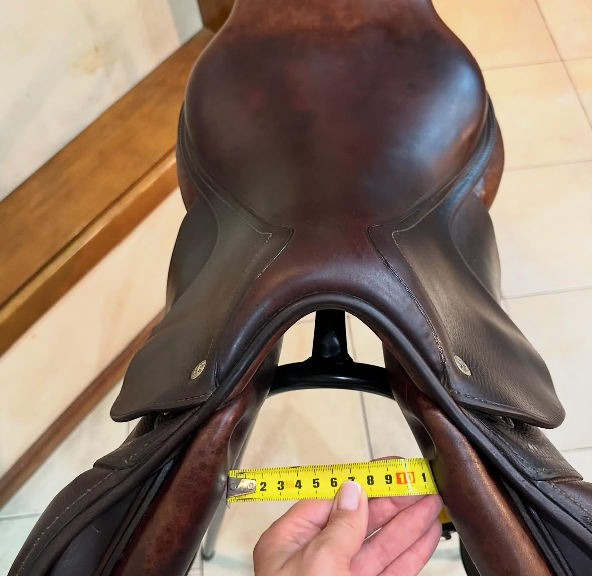 Selle de compétition classique française CWD SE02 avec prise semi-profonde, taille du pilote 18 » (en fait 46 cm convient 17.5 »), aile 4C (38 cm de long) pour les pilotes 175 cm ou plus. Une selle pour un dos de cheval moyen large (34 Prestige), adaptée à un étalon grand mais pas vide. Selle en bon état usure normale en housse d’origine à prix petit