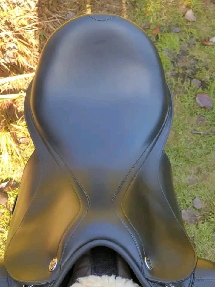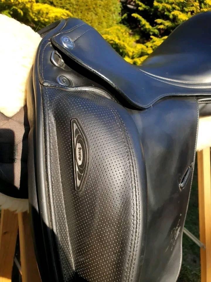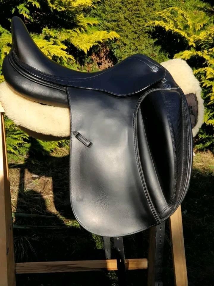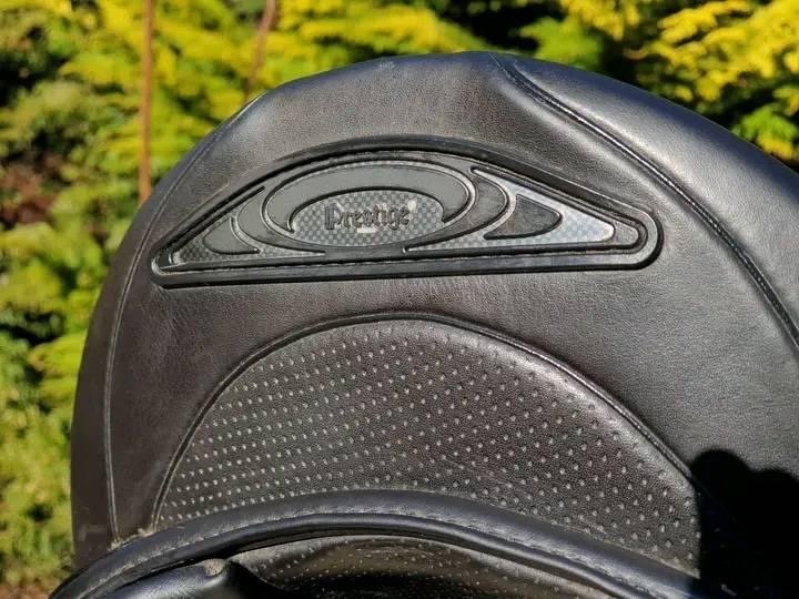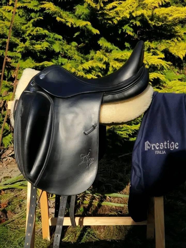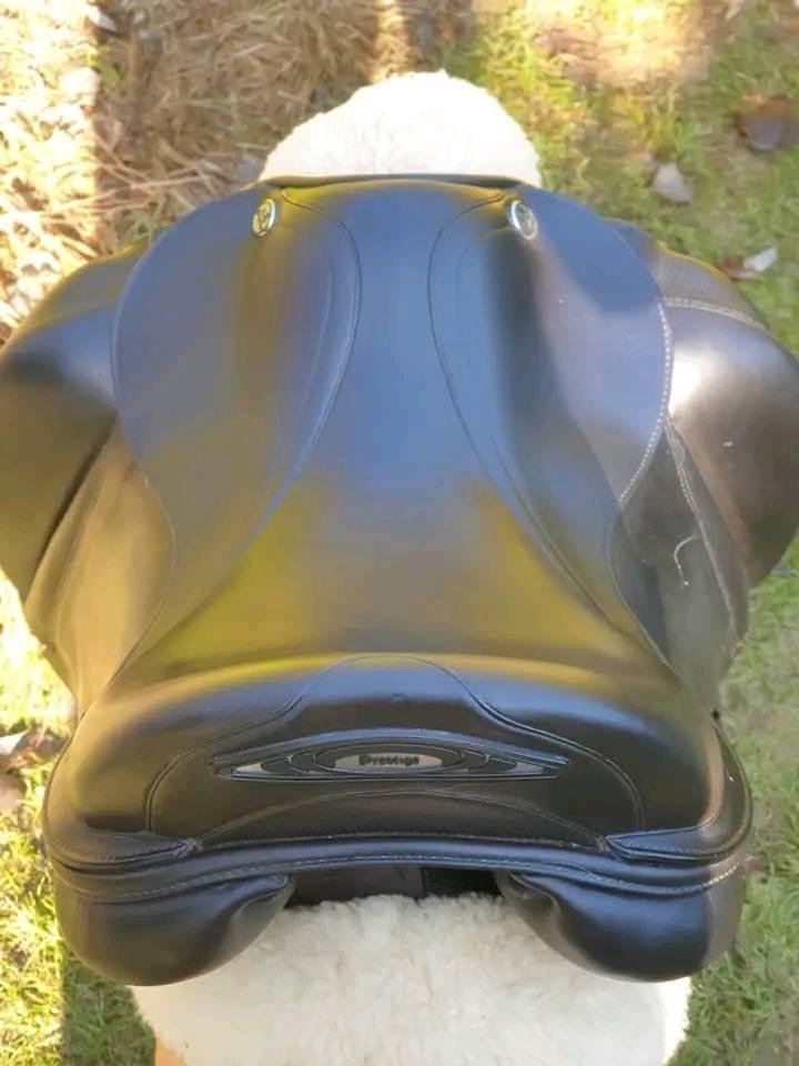 Prestige. Taille 17″, la largeur a été changée en 35, entièrement entretenue par Prestige – flocage de laine vierge. Option veau complet, la selle est en très bon état. Livrée avec housse