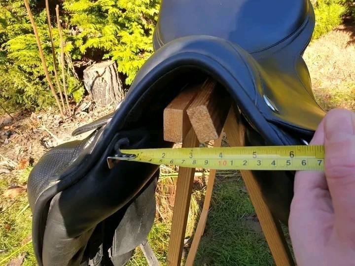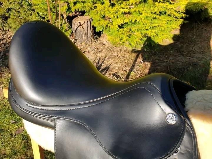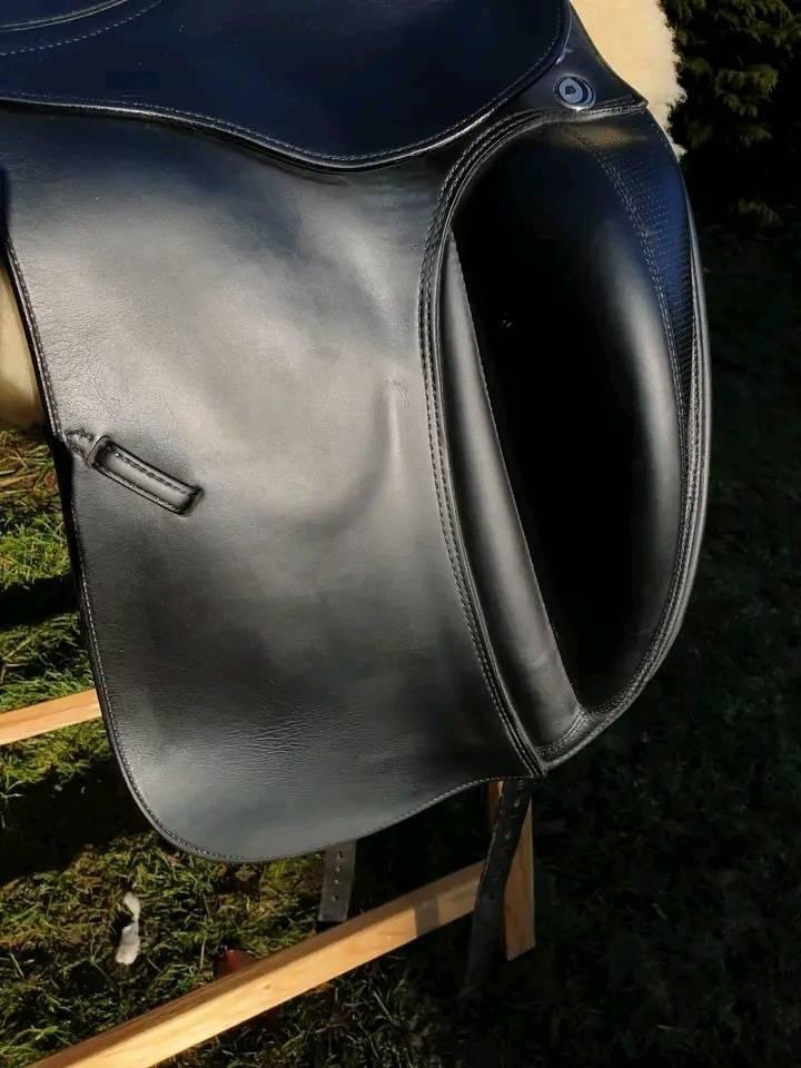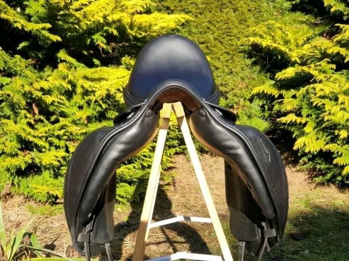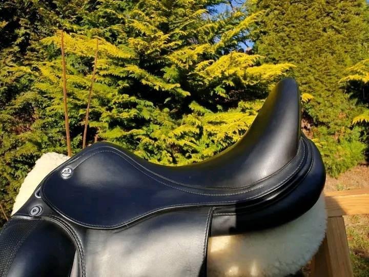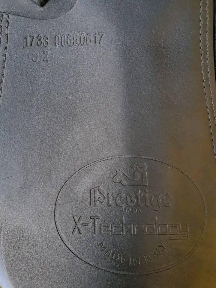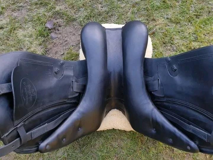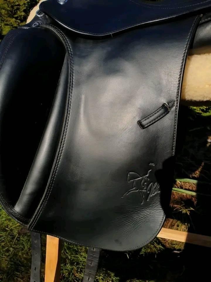 Prestige. Taille 17″, la largeur a été changée en 35, entièrement entretenue par Prestige – flocage de laine vierge. Option veau complet, la selle est en très bon état. Livrée avec housse